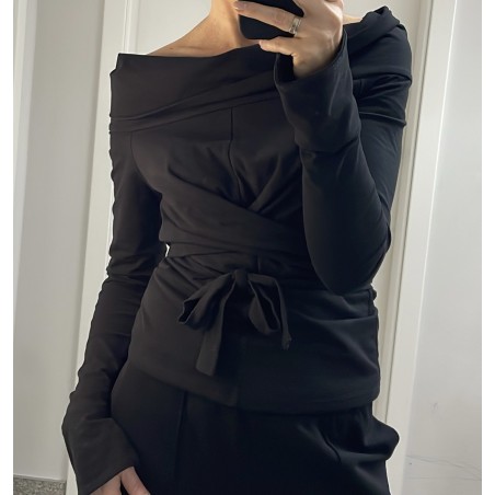 Drapowana bluzka z odkrytymi ramionami i wiązaniem- model sculpt black.